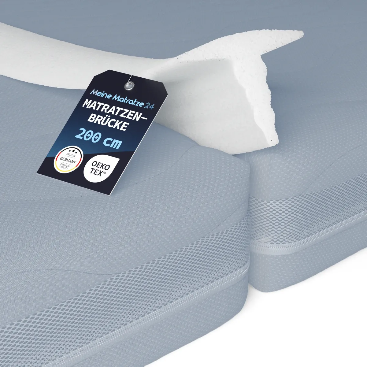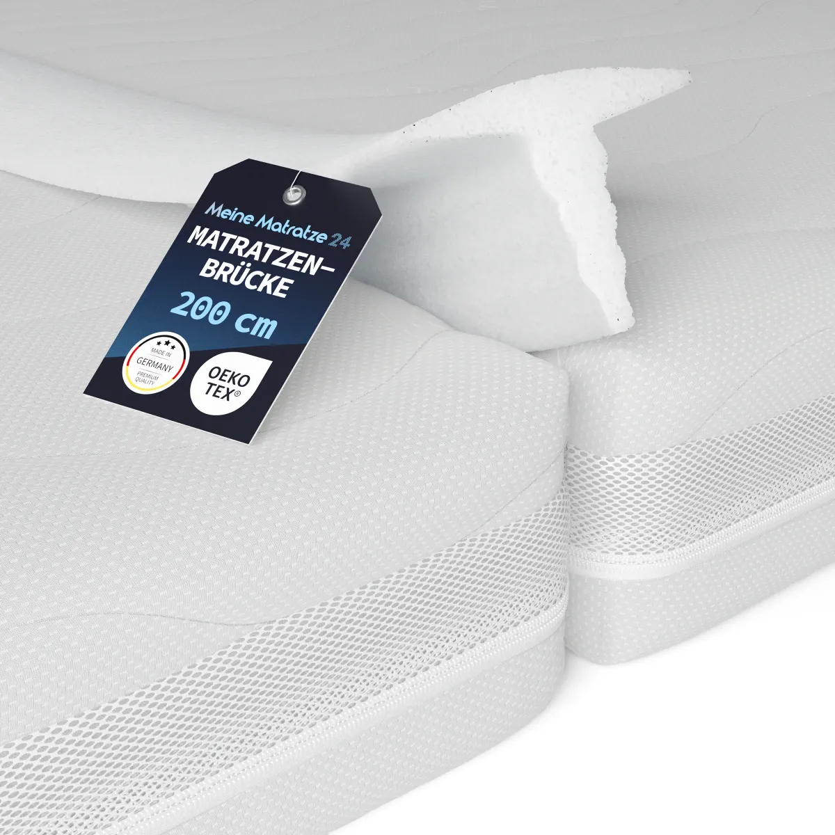 Die Matratzenbrücke schließt zuverlässig die Lücke zwischen zwei Matratzen – für ein durchgehendes Liegegefühl ohne störende Besucherritze. Der Ritzenfüller besteht aus hochwertigem PUR-Komfortschaum und sorgt für eine gleichmäßige, komfortable Schlafoberfläche. Mit einer Länge von 200 cm, einer Breite von 18 cm und einer Höhe von 12 cm passt sie perfekt auf handelsübliche Doppelbetten. Der geriffelte Mittelsteg verhindert ein Verrutschen und garantiert eine stabile Verbindung.