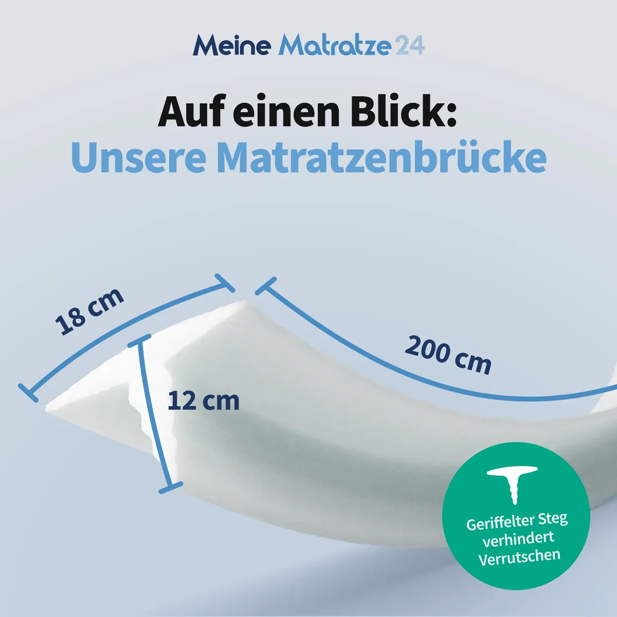 Länge: 200 cm – Breite: 18 cm – Höhe: 12 cm Die Brücke passt perfekt für gängige Matratzenformate und sorgt für eine unsichtbare Verbindung.